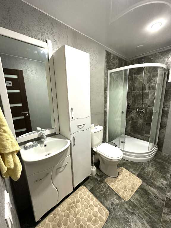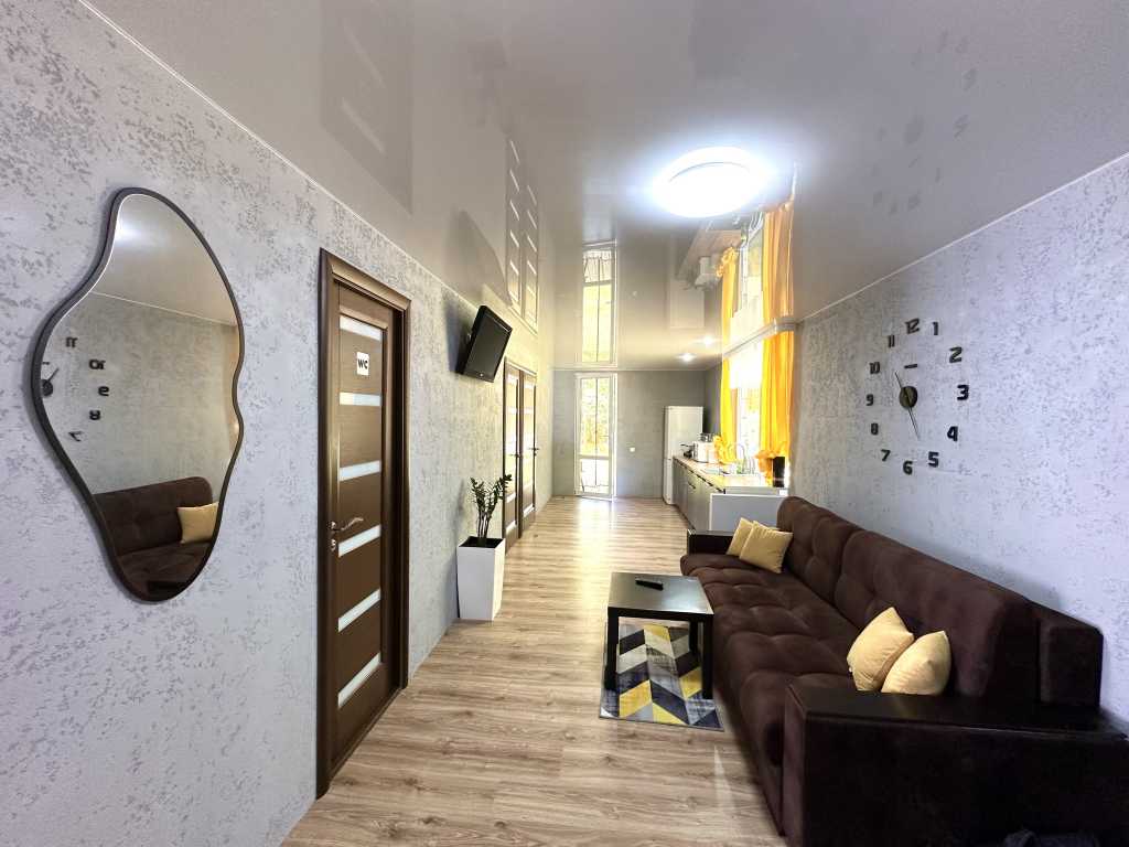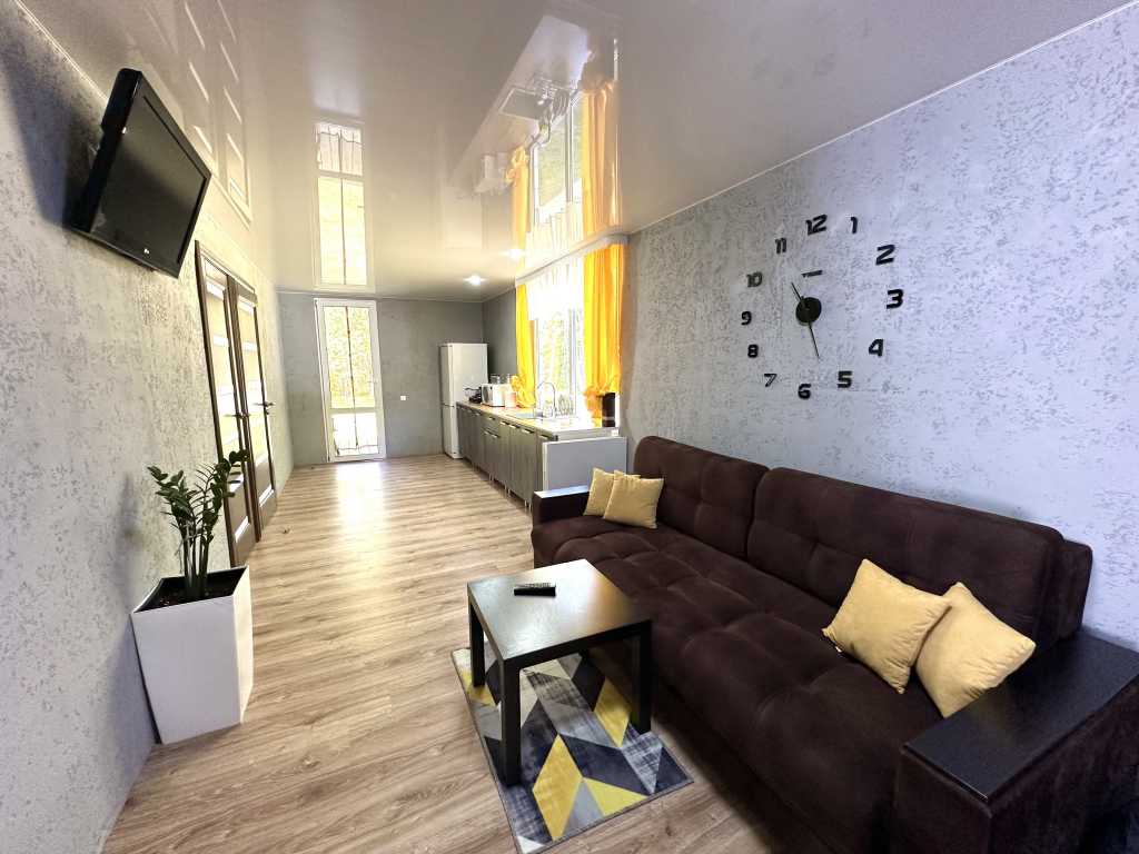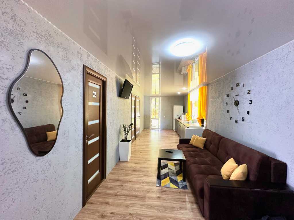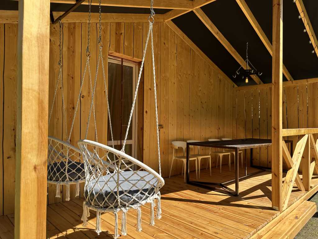 Вместительность 10 человек. В доме есть 4 комнаты в каждой 2-х спальная кровать, прихожая с большим диваном и уличная терраса с качелями. На территории собственная скважина.